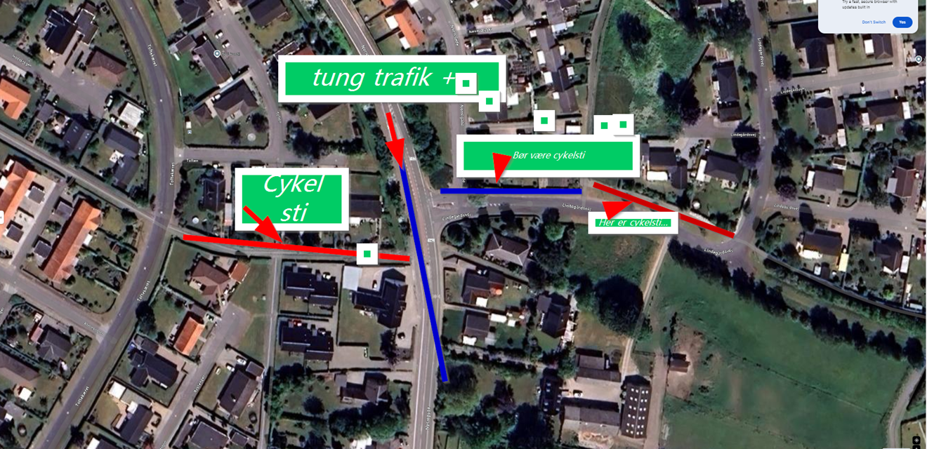 Jeg har små børn og vi tør ikke cykle på den rute, da vejene er smalle og der ofte bliver kørt meget stærkt derude. Det er gældende for både lastbiler, personbiler og